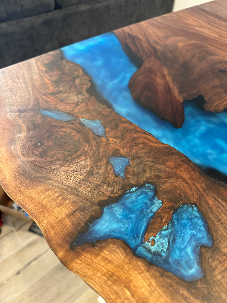Woodworking was always a goal of mind for later in life, a retirement plan. But after a thought of, “Why Wait?” popped into my head; I started to educate and seek out as much information on how to create tables like this. I have experience from my dad, who is a skilled carpenter in the trade of almost 40 years teach me how to use equipment and tools. I was equipped with not only the knowledge of him and woodshop class in high school but the tools aswell from my dads shop. I just needed to do the work at this point. I created my first epoxy table in early 2021 with a piece of live edge walnut and blue epoxy for my dad. From here, I was eager to learn more and create my own style of crafting these unique tables.